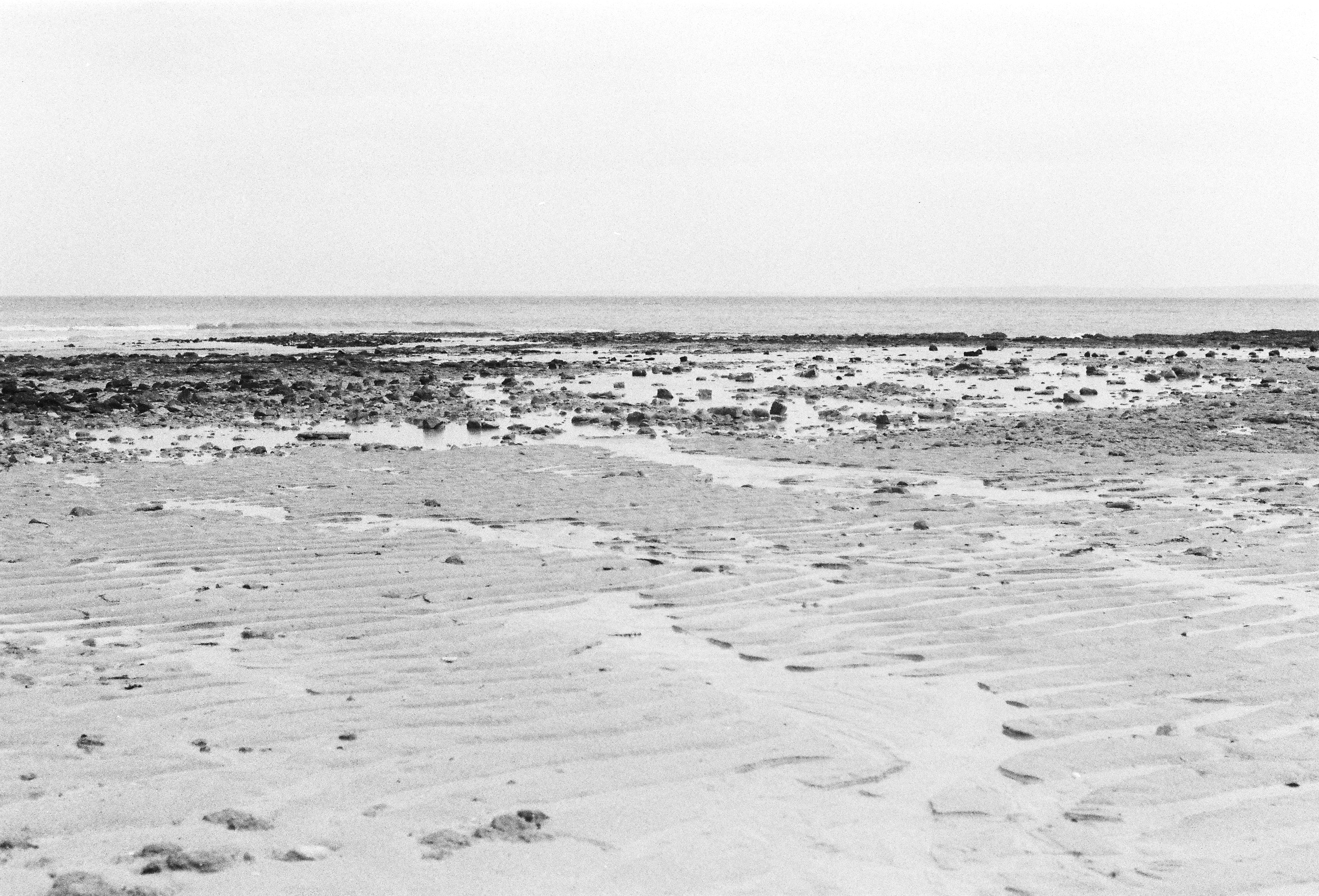 La mer au loin se distingue à peine du ciel et du sable. Les roches créent un paysage sec dans ce milieu pourtant humide.
